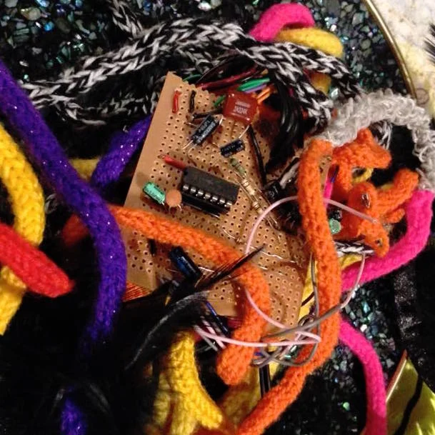 Phantom Chips makes her own wearable synthesizers that can be stretched and squeezed to create sound. Her homemade ‘lectronix squeals create bent charm and harsh mangled tones through tactile electronics. Concocting rhythms from an array of homemade electronic instruments, samplers and wearable noisemakers Phantom Chips gets the audience wearing electronics and making noise.