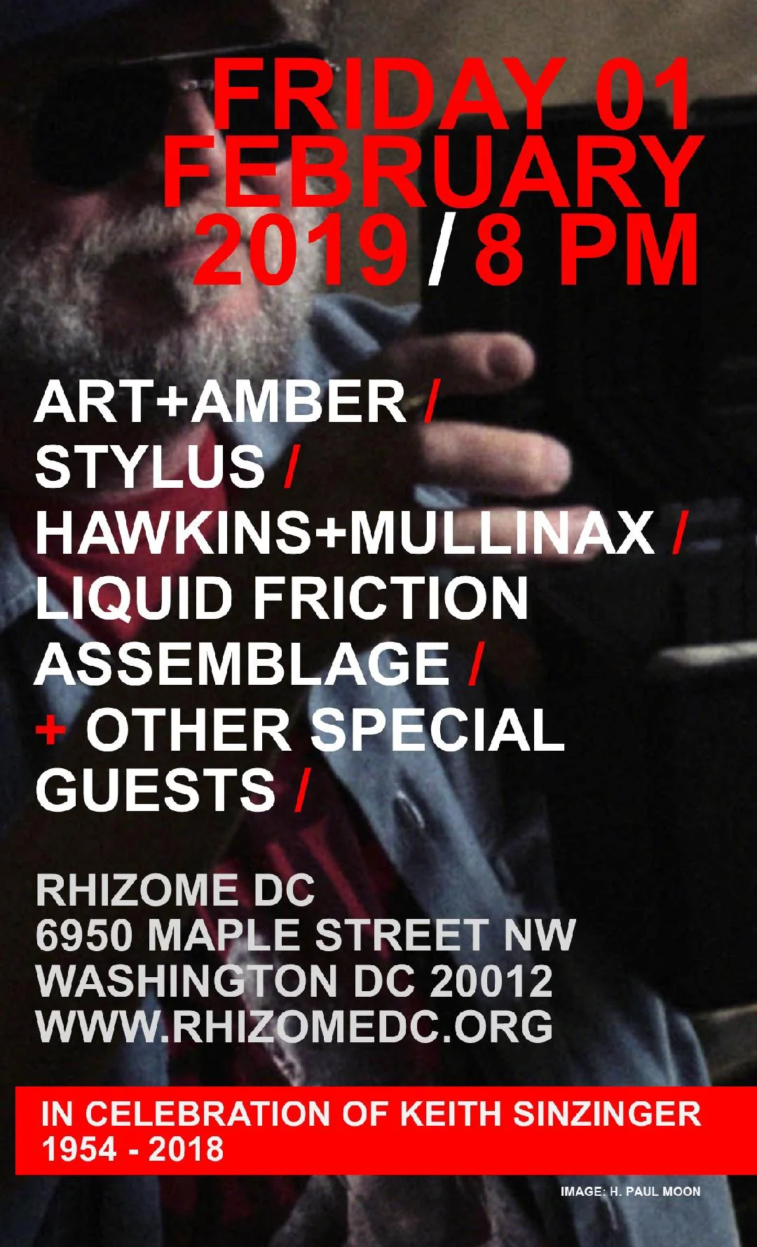 In Celebration of Keith Sinzinger (1954 - 2018) Friday, February 1, 2019 8:00 PM 11:00 PM 20:00 23:00 Google Calendar ICS Friday February 1 * 8pm * $10 suggested * TicketsA night of music in celebration of the life and creative legacy of Keith Sinzinger (1954-2018).Featuring:Art+AmberStylusHawkins+MullinaxLiquid Friction AssemblageOther special guests