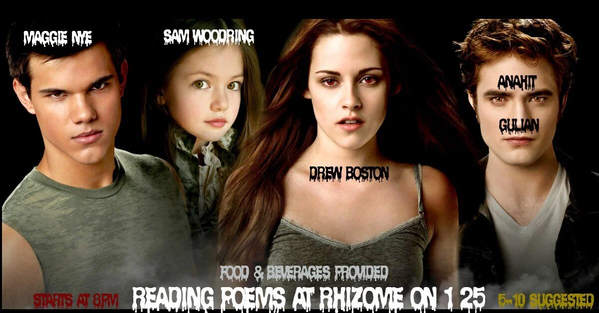 Friends reading poems! There will be food and drink. 5-10 dollar suggested donation.