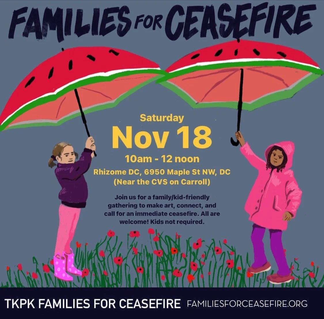 Inspired by the Families for Ceasefire: National Day of Action on November 12, we invite you to join us in Takoma on November 18 for a family/kid-friendly gathering to make art, connect, and speak up however we can in the name of an immediate ceasefire.