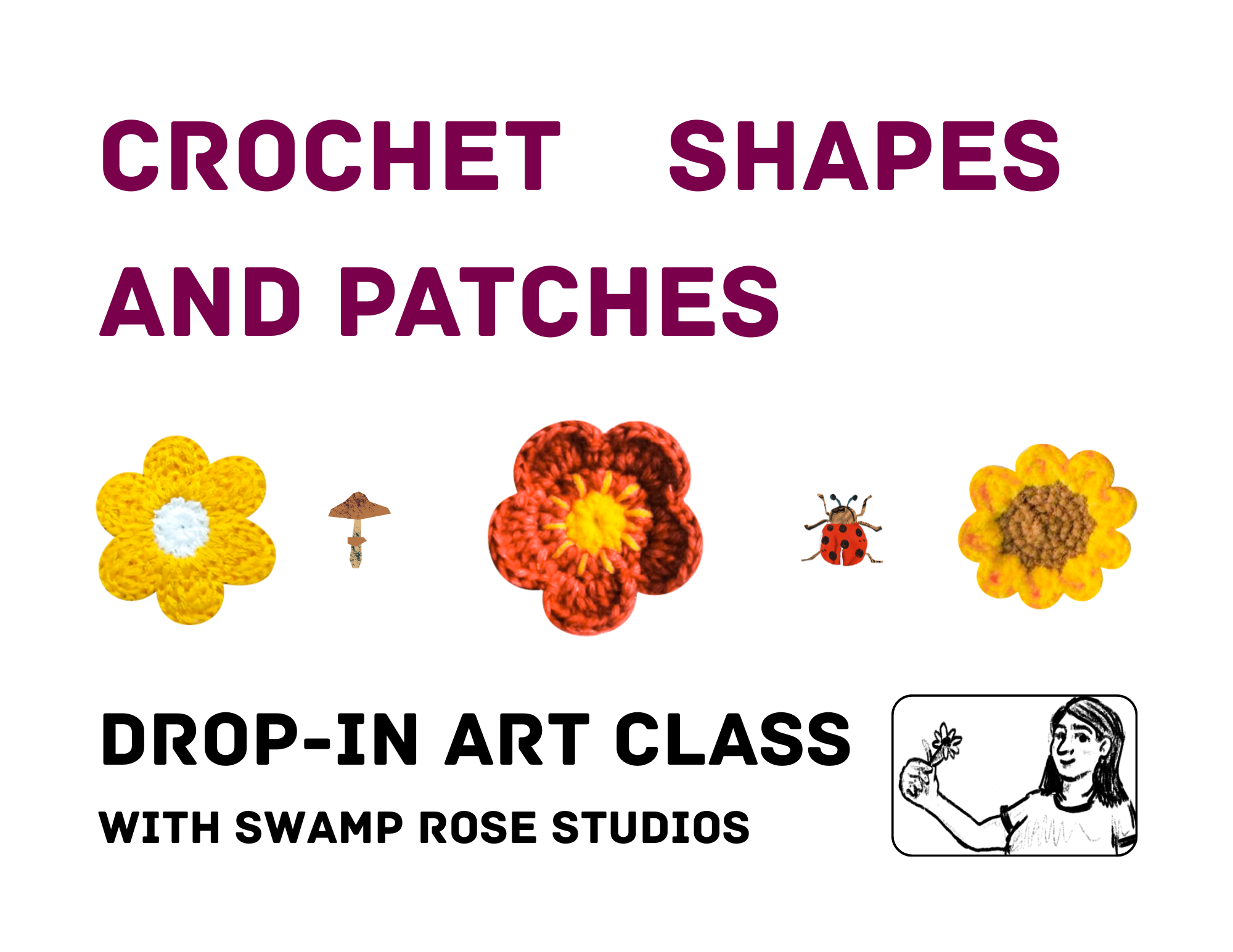 Join Swamp Rose Studio for a pay-what-you-can crochet class focusing on making flat shapes, AKA applique. We will learn how to make shapes and patches that can be used to add pockets, decorate a project, or repair holes. No experience necessary, but recommended for best experience: slip knot, single crochet, chain stitch.