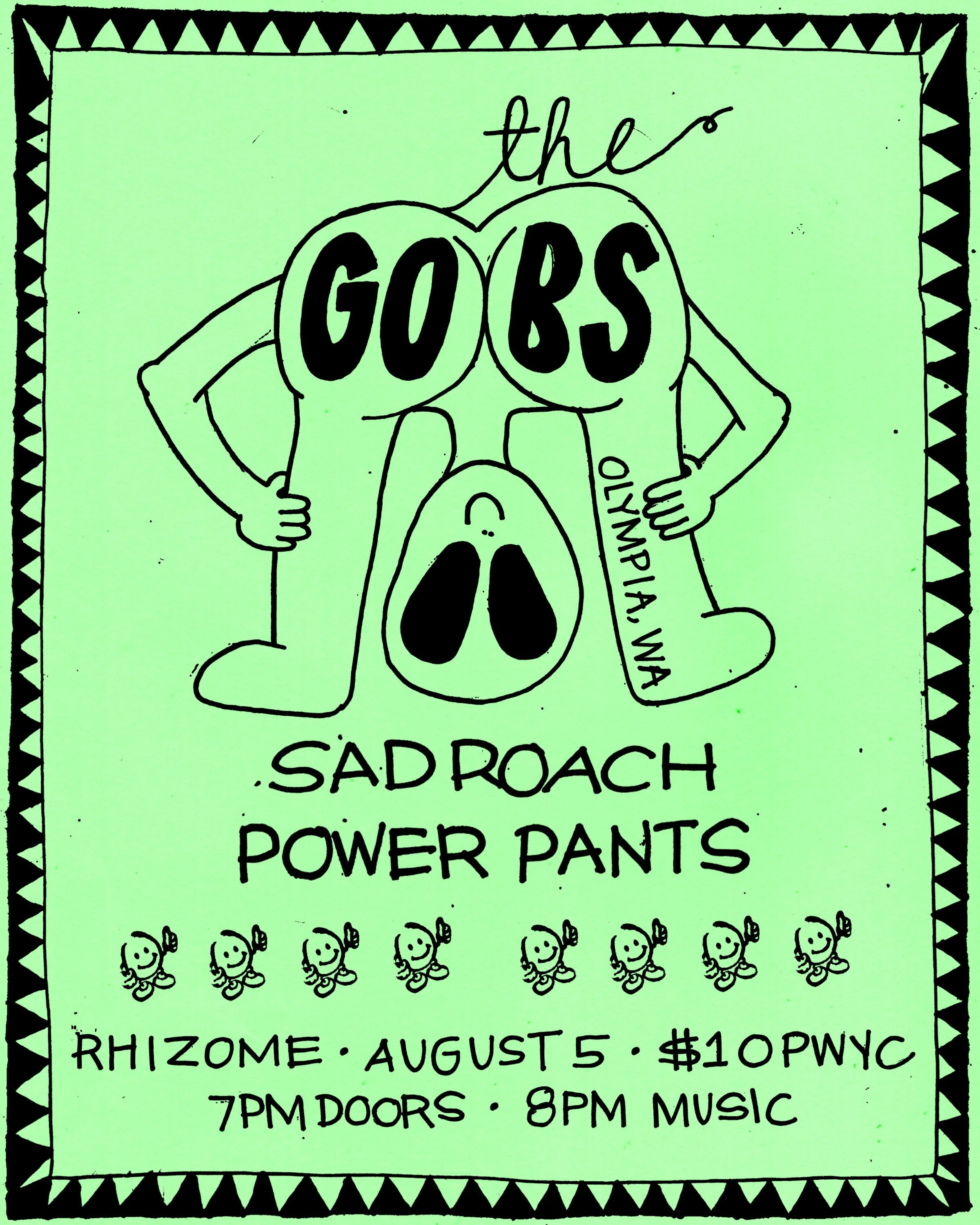The Gobs / Sad Roach / Power Pants Tuesday, August 5, 2025 7:00 PM 8:00 PM 19:00 20:00 Google Calendar ICS Tuesday August 5 * 7pm * $10 * TICKETSThe Gobs (Olympia, WA)Sad Roach (DC)Power Pants (VA)