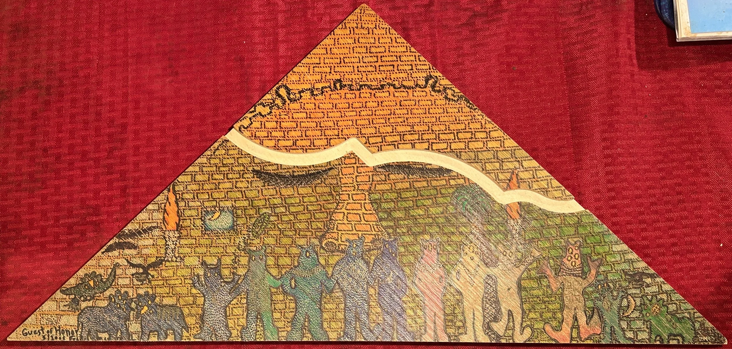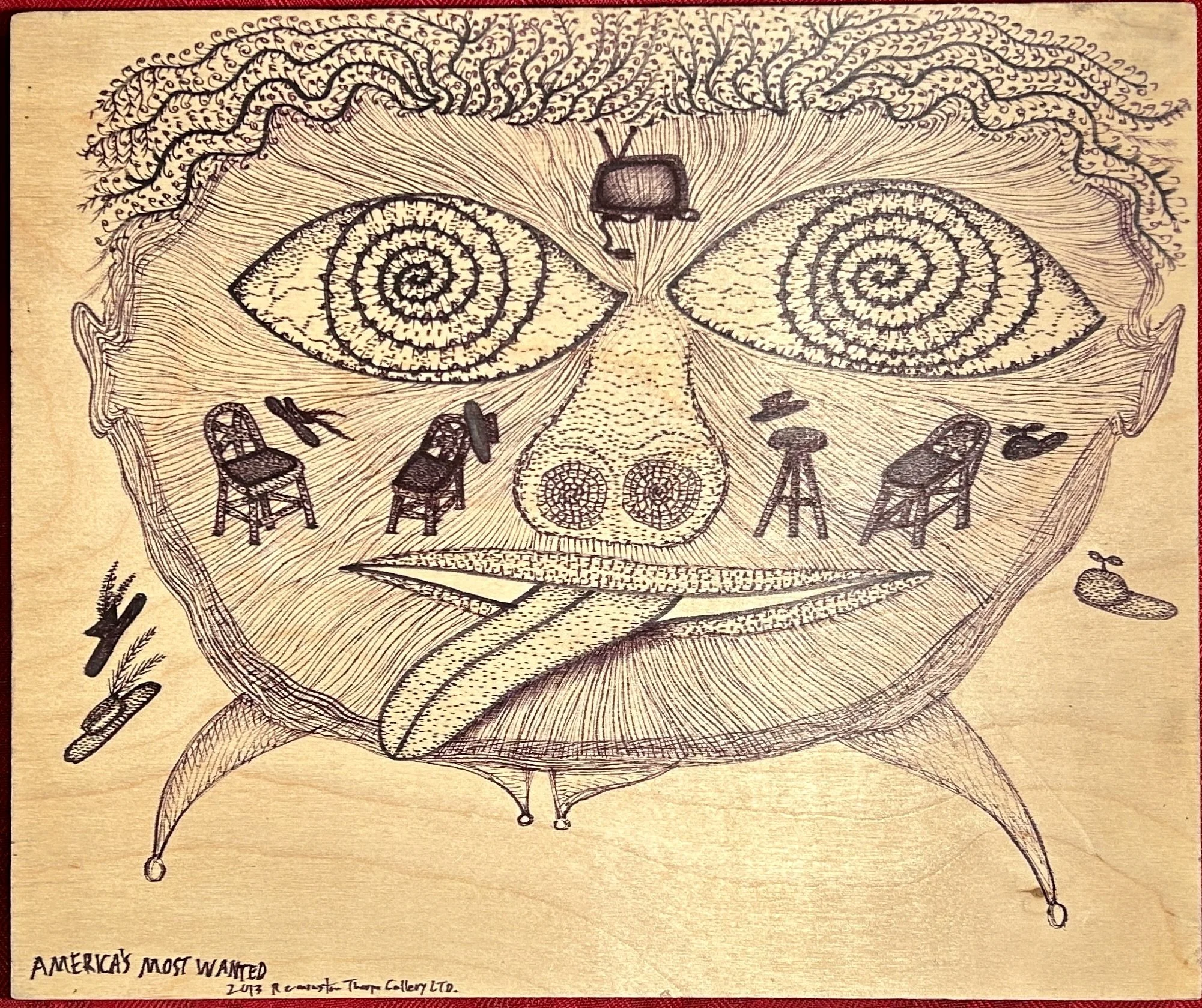 In Fred’s reality, corporations become detailed micron illustrations of telephone monsters with tendrils and tongues, Barry Manilow deserves an altar, and sculptural creatures bend and blend into the landscape. There’s the sounds too– atonal harps built from scrap wood and found objects like shark teeth, guitars with hands and feet. A self-taught artist, everything is medium.